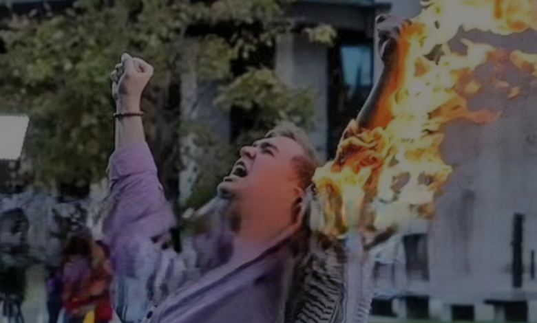 شاب في الثلاثينيات من العمر، يتقدم حشد المتجمهرين تحت رقابة الشرطة، قبالة مقر الرئاسة الأميركية، للاحتجاج على الحرب الإسرائيلية المستمرة على قطاع غزة، ثم يفاجئهم بإشعال النار في ذراعه اليسرى وهو يصيح “نشرنا المعلومات المضللة. أنا صحافي.. جعلت الأمر يبدو كأنّه طبيعي.. إلى 10 آلاف طفل في غزة ممن فقدوا طرفا في هذا الصراع.. أعطيكم ذراعي اليسرى.. ليرفع صوتي صوتكم كي لا تختفي ابتساماتكم (…)”.