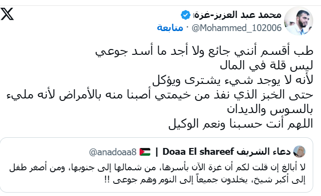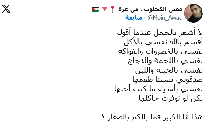 ووصلت أزمة الغذاء في قطاع غزة إلى مستويات غير مسبوقة حتى أصبحت صرخات الجوع تملأ مواقع التواصل الاجتماعي، فالصمت عن الجوع ليس عيبا، كما يقول معين الكحلوت الذي كتب عبر حسابه في منصة إكس “لا أشعر بالخجل عندما أقول نفسي بالأكل.. نفسي بالخضروات والفواكه.. نفسي باللحمة والدجاج.. نفسي بالجبنة واللبن، صدّقوني لقد نسينا طعمها، ونفسي بأشياء ما كنت أحبها لكن لو توفرت سآكلها”.