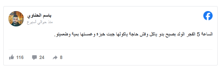 وتابع “الساعة 5 فجرًا، استيقظ الولد يبكي يريد أن يأكل ولا يوجد ما يأكله، لقد غمست الخبز في الماء وأطعمته”.