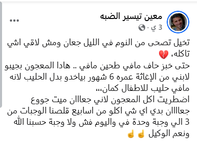 وكتب عن قصته قائلا “لا يوجد خبز ولا حتى طحين (دقيق)، هذا المعجون جلبته لابني من الإغاثة، عمره 6 أشهر، يأكله بدلا من الحليب لأنه مقطوع أيضا.. اضطررت لأكله لأني أموت من الجوع. منذ أسابيع قلصنا الوجبات اليومية من ثلاث إلى واحدة، لكن اليوم لا نجد هذه الوجبة”.