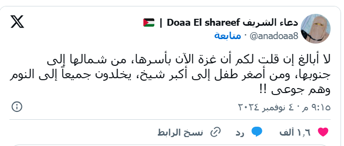 بينما لا ترى دعاء الشريف في صرخات الجوع أي مبالغة، فهي ترى أن غزة، من شمالها إلى جنوبها، ومن أصغر طفل إلى أكبر شيخ يخلدون إلى النوم جوعى خلال حرب لم ينفك الاحتلال فيها عن إسقاط كل أشكال العذاب على سكان القطاع قصفا وتهجيرا وتجويعا وإبادة.