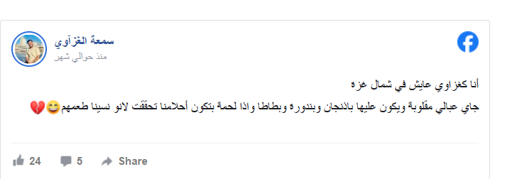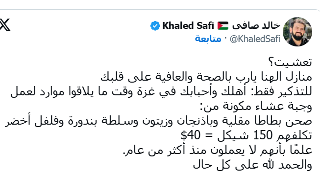 الناشط خالد صافي شارك شيئا من هذه الظاهرة، وأوضح عبر حسابه في منصة “إكس” أن تكلفة إعداد وجبة عشاء لسكان غزة في هذه الحرب، مكونة من طبق بطاطا وآخر باذنجان مع زيتون وبندورة وفلفل أخضر، تصل إلى 40 دولارا.