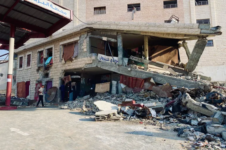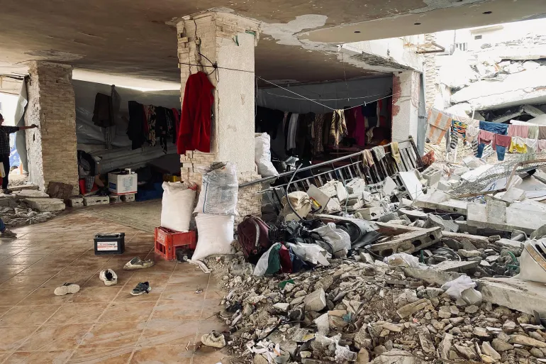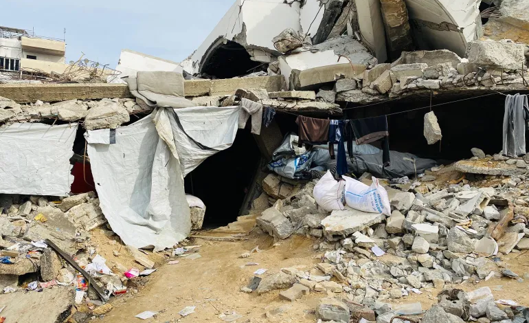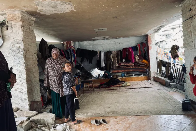 على مفترق طرق صاخب وسط مدينة غزة حيث محطة وقود مدمرة، تتعجب من وجود أحبال غسيل تتدلى على حافة المبنى المنهار، وأغطية قماشية تسد ثغرات واسعة أحدثتها قذائف الحرب، تقترب أكثر فتكتشف مأوى غير اعتيادي حيث غرفة بلا باب، تضم أكثر من 10 عائلات نزحت قسرا من مخيم جباليا، هربا من الموت الذي يلاحقهم.