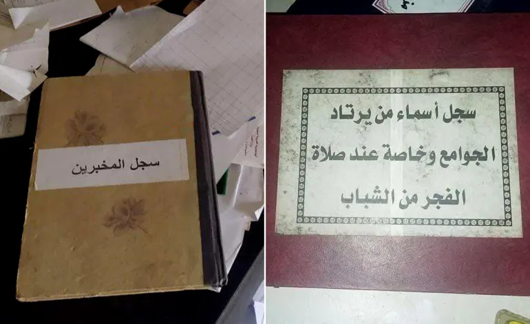 وانتشرت على منصات التواصل صورة لسجل وجد في أحد الأفرع الأمنية معنون بـ”سجل أسماء من يرتاد الجوامع وخاصة عند صلاة الفجر من الشباب”.