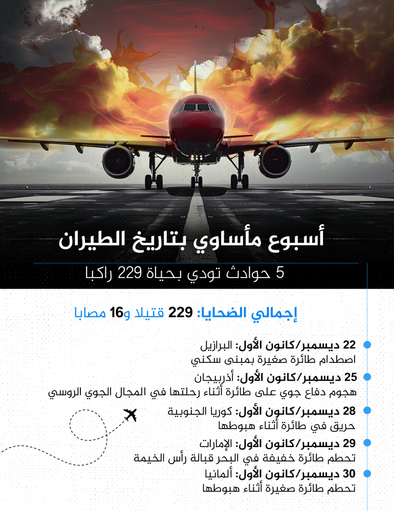 في أسبوع مأساوي بتاريخ الطيران المدني في العالم شهد الأسبوع الأخير من العام الحالي 5 حوادث أودت بحياة 229 شخصا وإصابة 16 على الأقل.