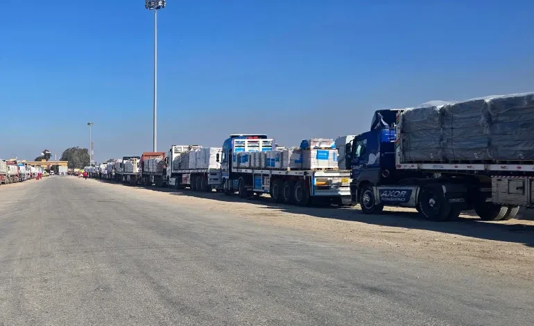 وصلت عشرات الشاحنات المحملة بالمساعدات الإنسانية، اليوم الأحد، إلى معبر كرم أبو سالم قادمة من مصر، تمهيدا لدخولها إلى قطاع غزة مع سريان اتفاق وقف إطلاق النار بناء على الموعد الذي حدده الوسطاء.