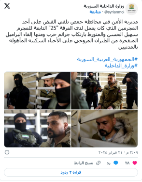 وقالت الوزارة -في بيان- ألقت مديرية الأمن في محافظة حمص وسط البلاد “القبض على أحد المجرمين” الذي كان يعمل لدى الفرقة 25 التابعة للواء بالنظام السابق سهيل الحسن المتهم بارتكاب جرائم حرب وإلقاء براميل متفجرة على الأحياء السكنية المأهولة بالمدنيين.
