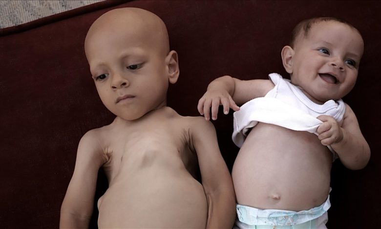 ويظهر على الطفلين انتفاخ في البطن وهو غالبا ما يصيب الأطفال الذين يعانون من “سوء التغذية”، جراء المجاعة المتفاقمة منذ مطلع مارس الماضي.