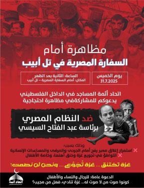 نقف يوم الخميس القادم أمام سفارة النظام المصري في تل أبيب، لا لأننا ننتظر عدلًا من ظالم، بل لأننا نرفض أن نصمت على تجويع غزة وخنق أطفالها، وعلى أن يكون معبر رفح أداة حصار بدل أن يكون شريان حياة.
