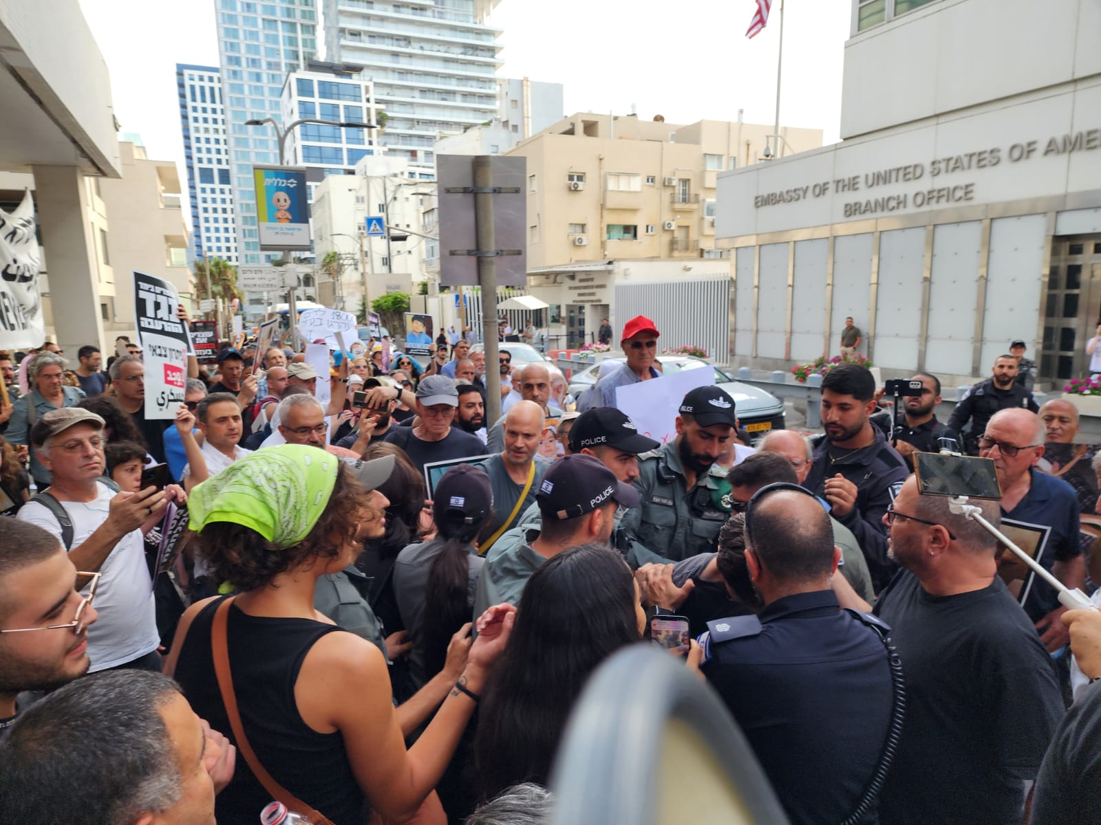 مظاهرة منددة بالتجويع والإبادة في غزة أمام السفارة الأميركية في تل أبيب (شاهد)