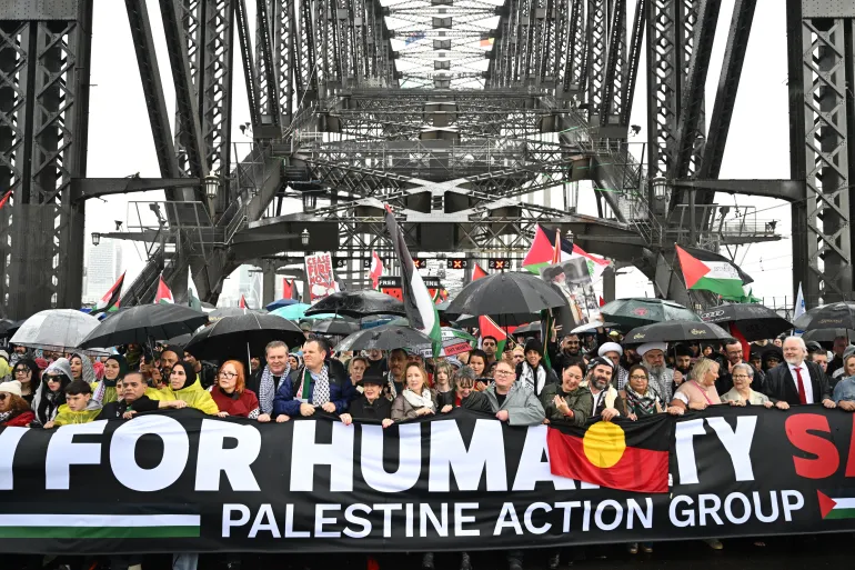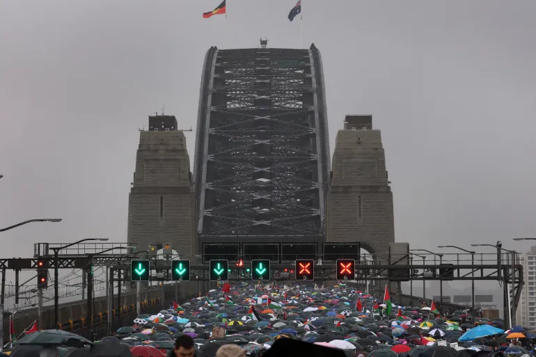 وكان منظر المتظاهرين وهم يعبرون جسر ميناء سيدني مهيبا، حيث تحدوا صعوبة الطقس من أمطار غزيرة ورياح عاتية للاحتجاج على العمليات العسكرية الإسرائيلية في قطاع غزة ولفت الانتباه إلى الأزمة الإنسانية هناك.