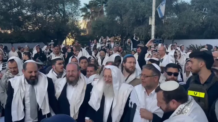 وأدى المتطرفون أيضا طقس “السجود الملحمي” (الانبطاح الكامل واستواء الجسد على الأرض ببسط اليدين والقدمين والوجه بالكامل) جماعيا، وارتدى بعضهم لفائف “التفلين”، ورفعوا العلم الإسرائيلي، ورددوا النشيد الإسرائيلي “هاتيكفا”، كما رقصوا وغنوا ورددوا أغنية “سيُبنى الهيكل”.
