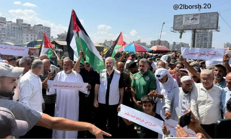 وتجمع المشاركون في الفعالية، في مفترق السرايا وسط مدينة غزة، ورفعوا لافتات، كتب عليها، “لن نرحل”، “النزوح من غزة إلى السماء فقط”، و”صامدين في غزة حتى طلوع الروح”.