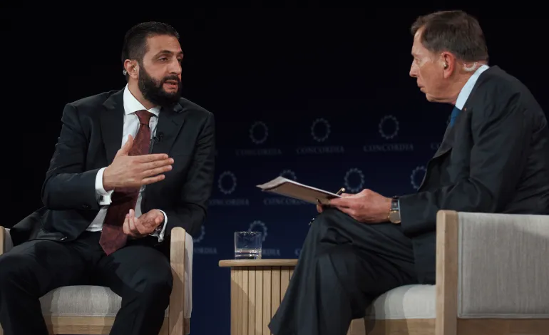 “من ميدان الحرب إلى ميدان الحوار”.. كانت هذه العبارة من أبرز ما لفت انتباه جمهور منصات التواصل الاجتماعي خلال اللقاء الذي جمع الرئيس السوري أحمد الشرع والجنرال ديفيد بتريوس، المدير السابق لوكالة الاستخبارات المركزية الأميركية، في جلسة أقيمت ضمن مؤتمر جامعة “كونكورديا” السنوي حول الأمن والديمقراطية، يوم أمس الاثنين في نيويورك، على هامش أعمال الجمعية العامة للأمم المتحدة.