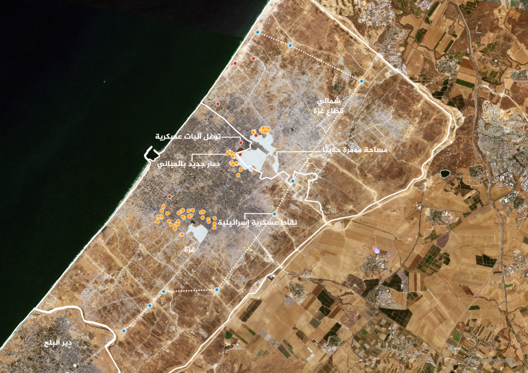 وحددت الصور عبر خريطة لشمال قطاع غزة 9 نقاط يتمركز فيها الجيش الإسرائيلي بشكل شبه ثابت حول مدينة غزة منذ أشهر، تقع في المنطقة العازلة التي فرضتها إسرائيل، تبدأ هذه النقاط من منطقة بيت لاهيا شمالا مرورا بمعبر إيرز، ثم شرقي جباليا وصولا إلى نقطة أخرى جنوبا باتجاه حي الشجاعية، بينما تتوزع 4 نقاط إضافية شرق حي الزيتون ونقاط أخرى بمنطقة نتساريم على طريق صلاح الدين.