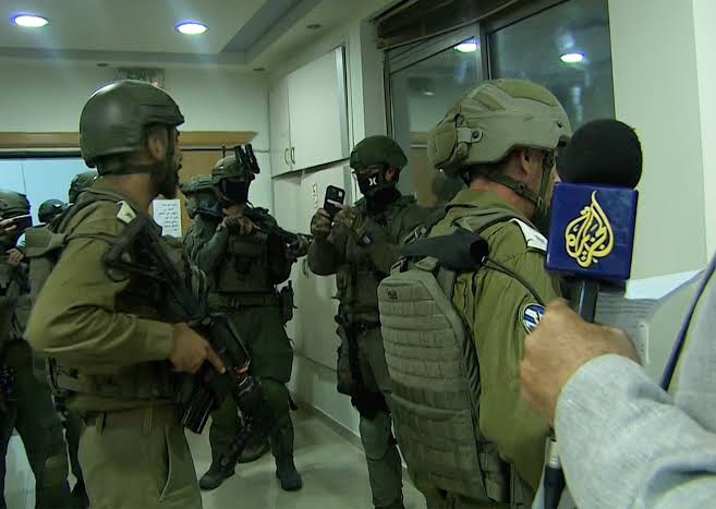 وقال الضابط وفق ما أظهرته المشاهد “أطلب منكم أن تأخذوا جميع الكاميرات وتغادروا المكتب في هذه اللحظة”، بينما كان جنود إسرائيليون مدججون بالسلاح ويضعون أقنعة يدخلون المكتب.