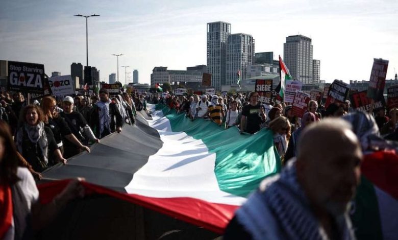 وتجمع مئات آلاف المتظاهرين قرب محطة إمبانكمينت في لندن بدعوة من حملة التضامن مع فلسطين “PSC”، ثم ساروا باتجاه شارع داونينغ حيث يقع مكتب رئيس الوزراء (رقم 10).