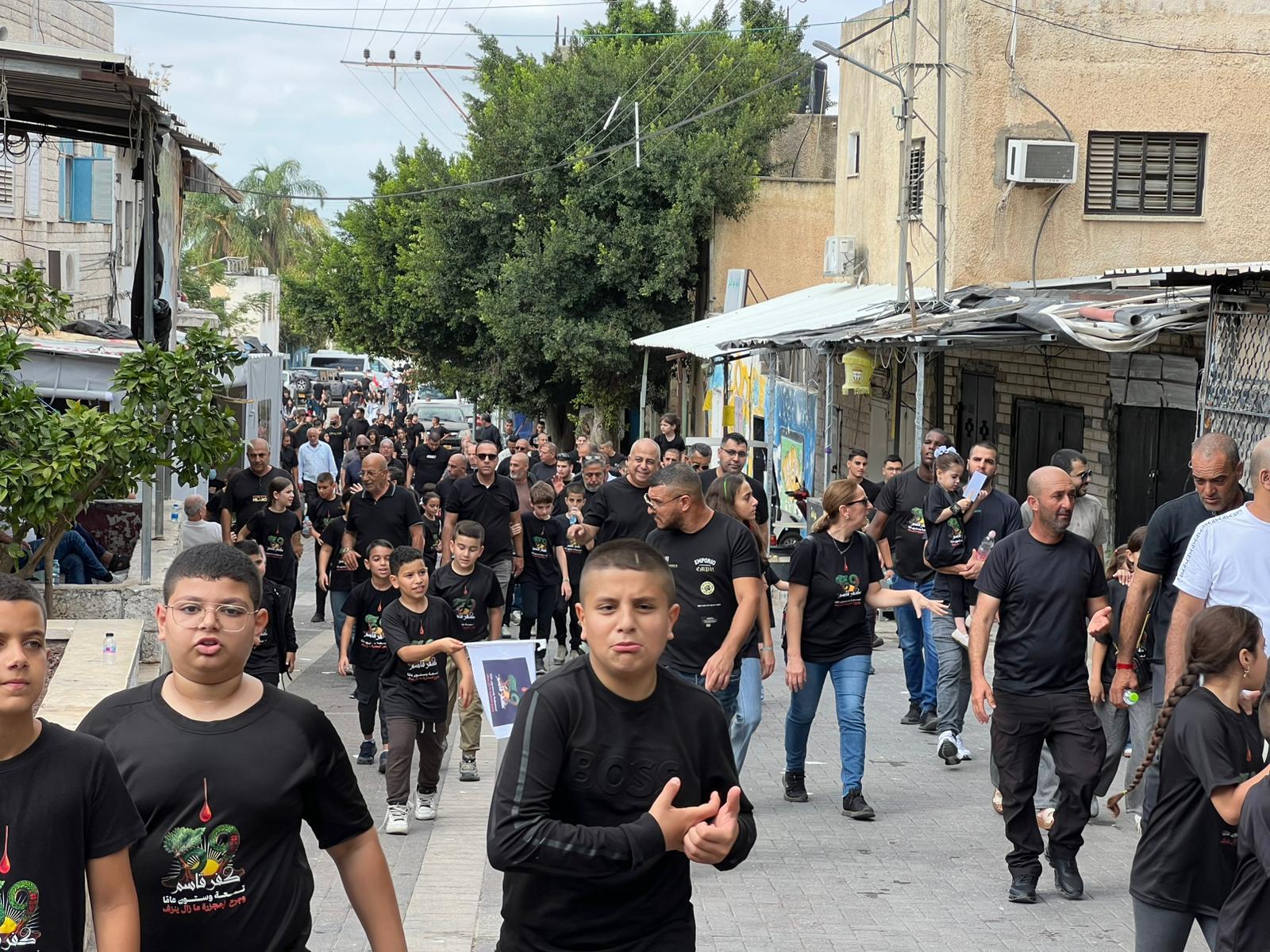 وارتدى المشاركون في المسيرة القمصان السوداء والتي كتب عليها “الذكرى الـ69 لمجزرة كفر قاسم، تسعة وستون عامًا وجرح المجزرة ما زال ينزف”.