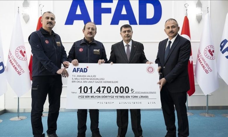 جمعت مدارس العاصمة التركية أنقرة، 101 مليون و470 ألف ليرة (نحو 2.5 مليون دولار) لدعم إعادة إعمار قطاع غزة المنكوب بعد حرب الإبادة الإسرائيلية.