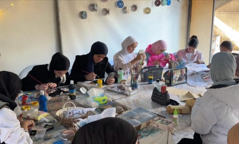 داخل هذه الخيمة البسيطة في مدينة دير البلح وسط قطاع غزة، تجتمع فتيات تتراوح أعمارهن بين 13 و18 عاما، فتمسك بعضهن بالألوان للرسم، وتدون أخريات خواطرهن، بينما تعيد مجموعة منهن تدوير مواد مهملة لصناعة الورود والحِرف اليدوية والنقش.