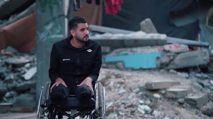 وفي مشهد آخر، يظهر شاب مبتور القدمين يجلس على كرسي متحرك، يدفعه طفل صغير بين الأنقاض.