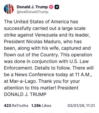 أعلن الرئيس الأميركي دونالد ترامب، فجر السبت، أن الولايات المتحدة نفذت ضربات عسكرية واسعة النطاق على فنزويلا، مؤكداً اعتقال الرئيس الفنزويلي نيكولاس مادورو وزوجته، وترحيلهما جوًا إلى خارج البلاد.