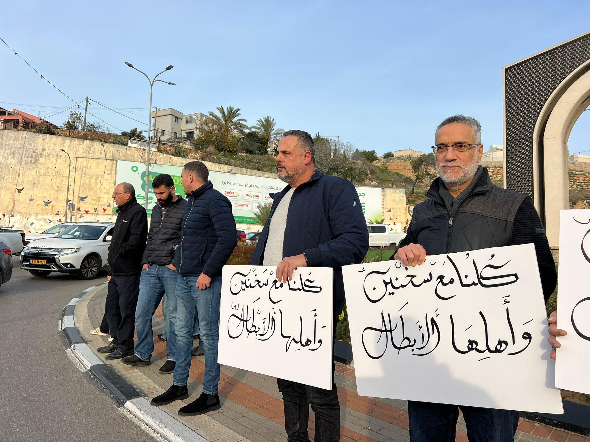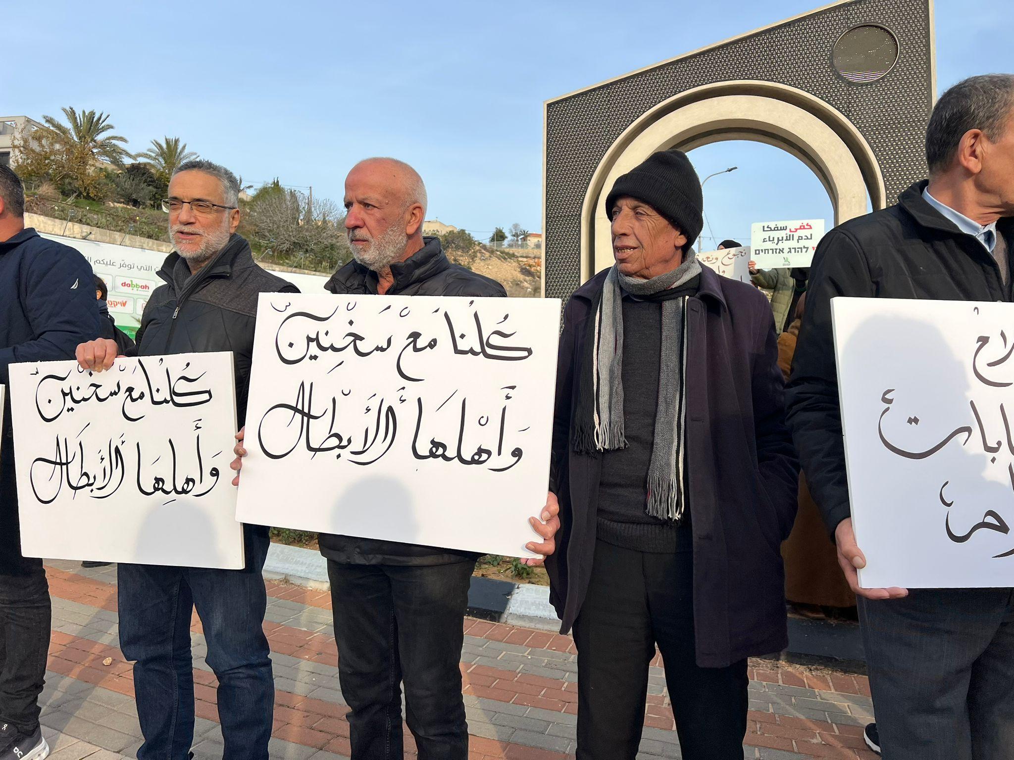 ورفع المشاركون لافتات طالبت الشرطة والسلطات الإسرائيلية بتحمّل مسؤولياتها، كُتب على بعضها: “اجمعوا السلاح وجفّفوا العصابات”، و“كلنا مع سخنين وأهلها الأبطال”، و“الشرطة هي المسؤولة عن الأمن والأمان”.