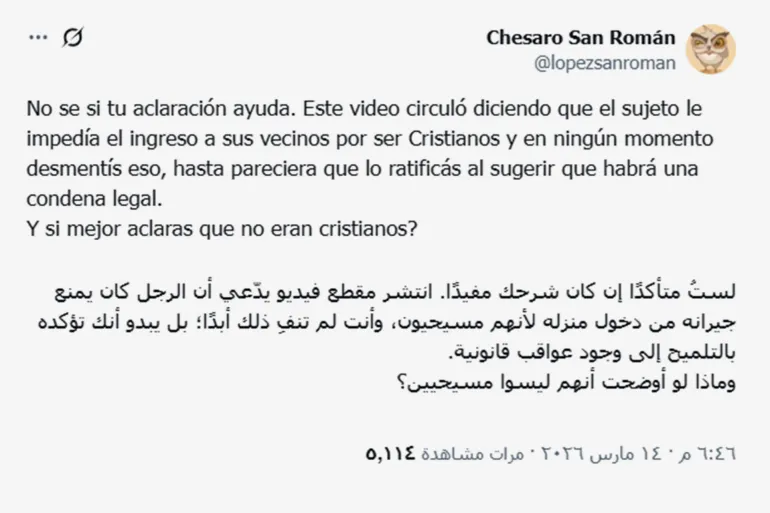 في المقابل، حاولت حسابات الدفاع عن الرواية الرسمية، مؤكدة أن العائلة التي ظهرت في الفيديو “ليست مسيحية بل يهودية”، وأن الرجل “خالف القانون وسيدفع الثمن”، في محاولة لنفي البعد الطائفي أو الديني عن الحادثة وحصرها في إطار فردي.