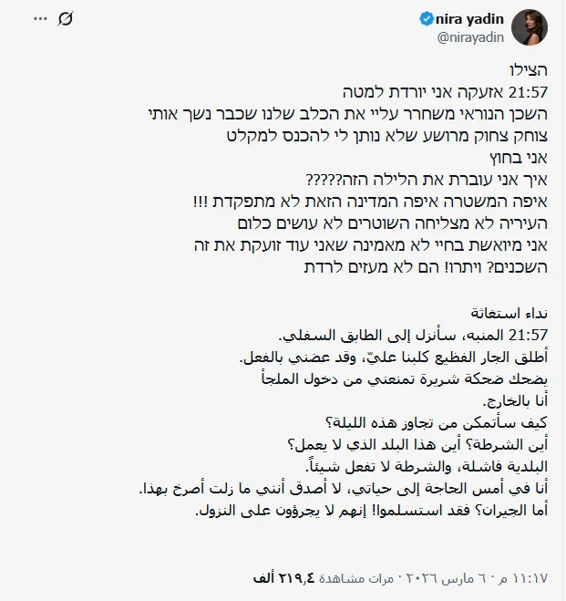 اللافت أن الفيديو دفع إسرائيليين آخرين إلى مشاركة تجارب مشابهة، من بينهم إسرائيلية تُدعى نيرا يادين، تحدثت في تدوينة نشرتها بتاريخ 6 مارس/آذار عن واقعة قالت إنها تعرضت لها مع جارها خلال إحدى جولات القصف، إذ كتبت: “أطلق الجار الفظيع كلبه علينا، وقد عضّني بالفعل. يضحك ضحكة شريرة ويمنعني من دخول الملجأ. أنا في الخارج، كيف سأتمكن من تجاوز هذه الليلة؟ أين الشرطة؟ أين هذا البلد الذي لا يعمل؟ البلدية فاشلة، والشرطة لا تفعل شيئا. أنا في أمسّ الحاجة إلى حياتي”.