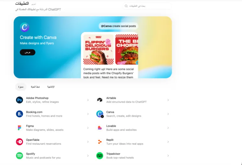 * كانفا (Canva): يسمح هذا التكامل بإنشاء تصاميم بصرية بسرعة، مثل منشورات وسائل التواصل الاجتماعي أو الملصقات أو عروض الشرائح، حيث يمكن للمستخدم وصف التصميم المطلوب، مع تحديد الألوان والخطوط والأبعاد، ليقوم شات جي بي تي بإنشاء نموذج أولي يمكن تعديله لاحقا داخل كانفا.