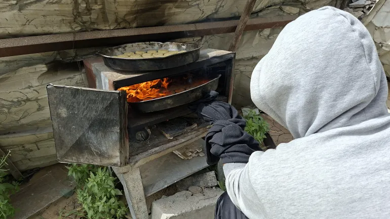 يزوّد الشاب عبد الله جمال فرنه الصغير بالأخشاب كي تبقى ناره متقدة حتى ينتهي من طهي مخبوزات النازحين المقيمين حوله في شمال القطاع.