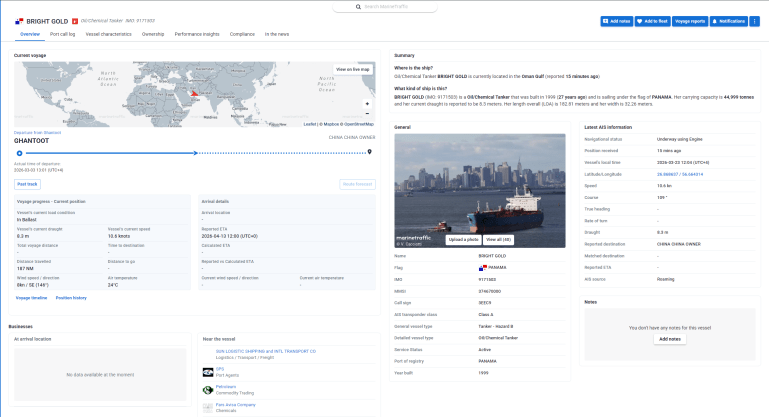 كما أظهرت البيانات أن “برايت غولد” وضعت عبارة “China Owner” في خانة الوجهة ضمن بياناتها الملاحية.