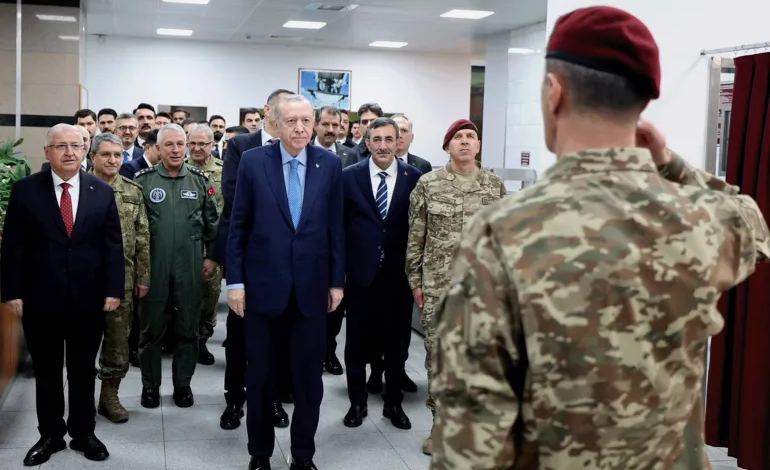 وتُظهر الصورة أردوغان في مقدمة مجموعة من المسؤولين المدنيين والعسكريين، بينما يؤدي جندي التحية العسكرية في مواجهته، في مشهد بروتوكولي يعكس رمزية القيادة والانضباط داخل المؤسسة العسكرية التركية.