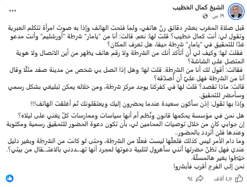 في المقابل، كشف الشيخ كمال الخطيب أنه تلقى اتصالًا هاتفيًا من جهة عرّفت نفسها بوحدة “يامار” في شرطة القدس، تطالبه بالحضور للتحقيق في حيفا، دون أي تبليغ رسمي مكتوب. وأوضح أنه شكك بهوية المتصلة، مطالبًا باستدعاء قانوني عبر القنوات المعروفة، إلا أنها هددته بالاعتقال قبل إنهاء المكالمة.
