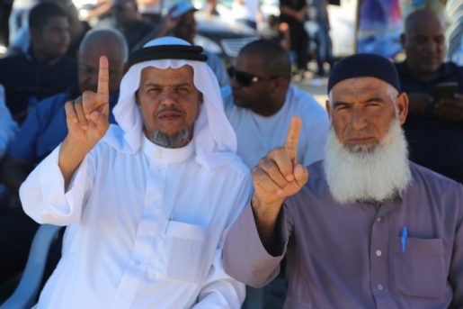 ثم تحدث رئيس لجنة المتابعة، محمد بركة، ووجه التحية إلى الشيخ صياح الطوري “الذي يفترش الأرض الآن عند المدخل الشمالي لرهط، المسمى “مفرق لهافيم”، صحيح هو ليس بيننا لكنه يمدّنا بالمعنويات وهو حاضر بصموده وقوته” كما قال.