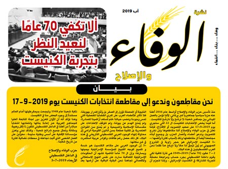 أما فيما يخص الانتخابات للكنيست ال 22 التي ستجري يوم 17-9-2019 على صعيد التصويت أو الاقتراع، فإننا نعلن في حزب الوفاء والإصلاح أننا مقاطعوها ولن نخرج للتصويت وندعو أعضاء وأنصار الحزب بل وجميع أبناء مجتمعنا أيضاً الى مقاطعتها وذلك لأسباب كثيرة وأهمها: –