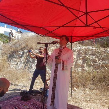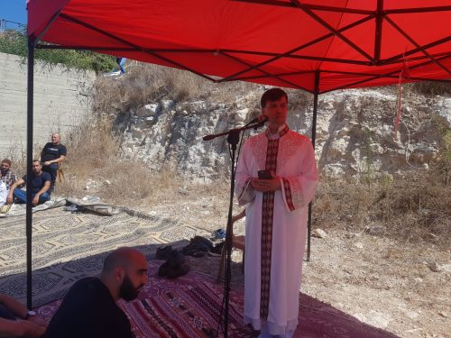 جانب من خطبة صلاة الجمعة الحاشدة في خيمة اللجنة الشعبية أمام مركز الشرطة في مدينة أم الفحم وخطيبها الدكتور رائد فتحي.