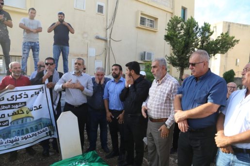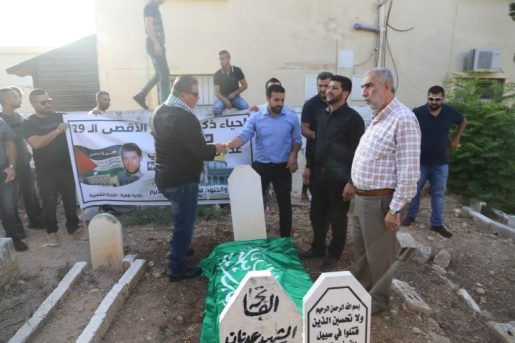 وبالقرب من المقبرة التي احتضنت جثمان الشهيد، ألقيت كلمات بالمناسبة، كانت الأولى لرئيس اللجنة الشعبية في طمرة، السيد محمد صبح، واشتملت على 3 رسائل، حيث أكد على “وحدة الدم والحال ووحدة الشعب الفلسطيني في كل أماكن تواجده تجاه قضايا شعبنا وفي مقدمتها المقدسات والأرض، ارتقى مع شهيدنا عدنان 20 من أبناء شعبنا وفي ذلك أكبر مثال على وحدة دم أبناء شعبنا في الضفة والقدس والداخل الفلسطيني”.