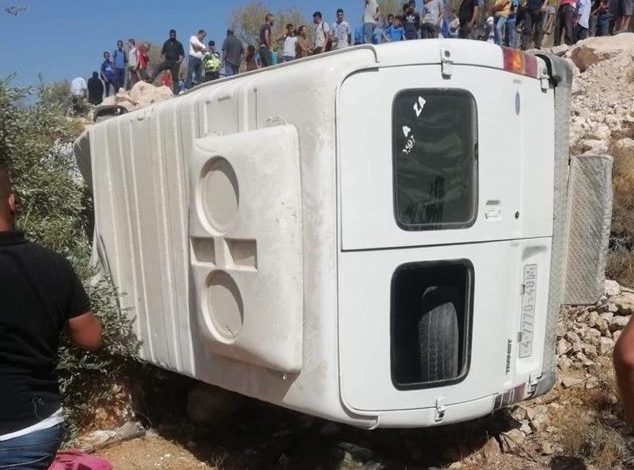 وافاد الطبيب هيثم الوحش من مكان الحادث بأن 13 طفلا اعمارهم ما بين 3- 4 سنوات اصيبوا بجروح طفيفة جراء انقلاب الحافلة التي تقلهم على الطريق الوعرة في بني تعمر قضاء بيت لحم”.