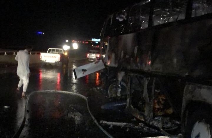 وأفادت وسائل إعلام سعودية بأن الحادث وقع بين مركبة وحافلة تقلُّ معتمرين من جنسيات مختلفة؛ فاشتعلت النيران في الحافلة.