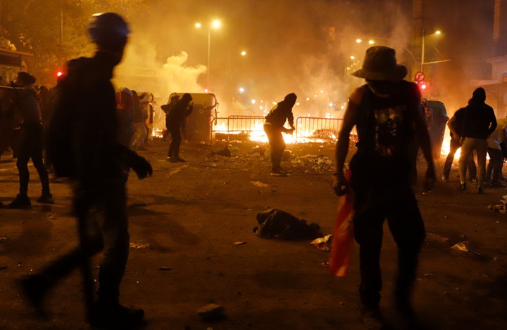 لكن مع حلول الليل أغلق شبان ملثمون شارعا واسعا قرب مقر شرطة المدينة وأضرموا النيران في صناديق قمامة كبيرة ورشقوا صفوفا من قوات مكافحة الشغب بوابل من الحجارة والزجاجات.