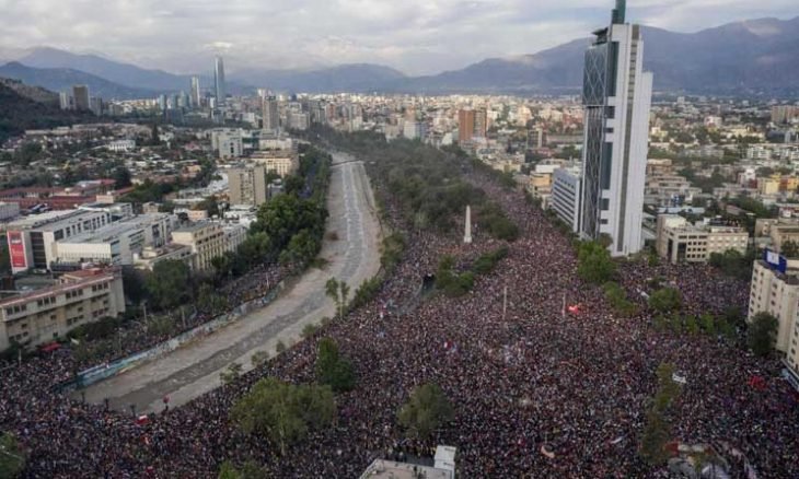وقالت روبيلار في تغريدة على موقع تويتر نشرت خلالها مقطع فيديو جوي للمتظاهرين في الشوارع، “تشيلي تعيش يوما تاريخيا اليوم. منطقة العاصمة سانتياغو شهدت اليوم مسيرة سلمية شارك فيها نحو مليون شخص يجسدون حلم تشيلي الجديدة”.